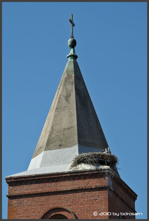 Nest 2 - Wir kennen den Horst noch aus der Zeit, wo er sich ohne Nestauflage auf dem schrägen Kirchturmdach befand. Da gehörte noch eine Menge Gottvertrauen dazu, um dort zu brüten. Jetzt hat er eine solide Unterlage, um drei Küken sicher versorgen zu können.